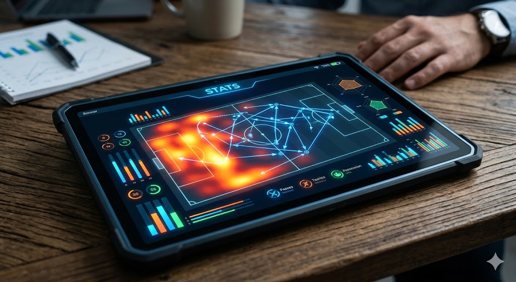 create image for; fotball-statistikk-skjerm.jpg – «A close-up of a tablet showing advanced football statistics like xG, heatmaps, and possession percentages for a Champions League match.»