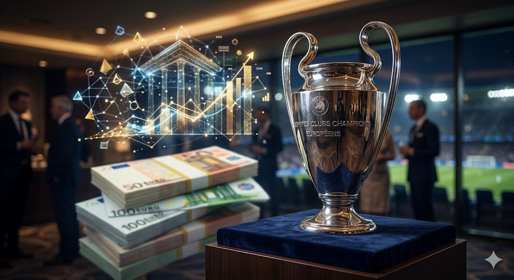 create image for; mesterligaen-pokal-penger.jpg – «The UEFA Champions League trophy sitting on a pedestal with blurred gold coins and financial charts in the background to symbolize prize money.»